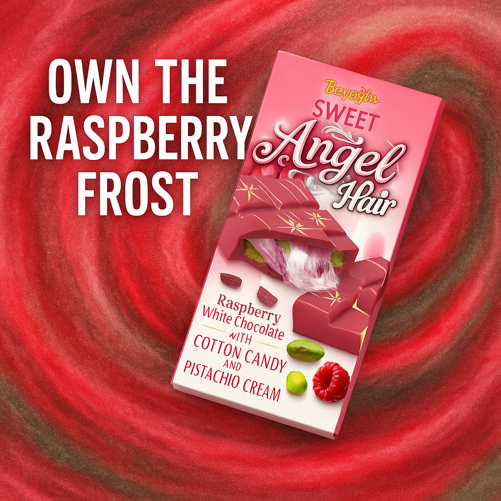 Indulge in the viral Dubai white chocolate bar by Beyoglu. This Angel Hair Raspberry White Chocolate layers silky white chocolate over creamy pistachio filling, topped with light cotton candy and crispy kataifi strands for a luxurious, Middle Eastern dessert experience.